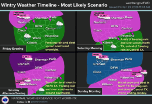 A significant surge of Arctic air will move into North and Central Texas beginning Friday evening and continuing through the weekend. Rain will transition to freezing rain and sleet Friday night into Saturday, with parts of North Texas seeing a changeover to sleet and snow late Saturday before conditions gradually improve on Sunday.